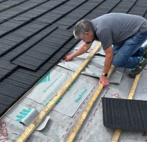 A close up of the newly fitted Metrotile Charcoal Woodshake tile.